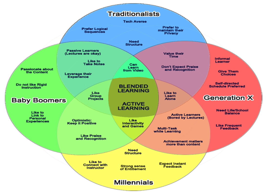 Finding the sweet spot in generation learning preferences commonalities involves a proper identification of an organization’s own generational representations figures firstly. There is no need to reinvent the wheel to recognize what these preferential similarities are. A bit of targeted “Googling” and one stumble across excellent pieces of information summarising the training preferences per generation and specific behavioral traits to consider in the design and execution of training curriculums.