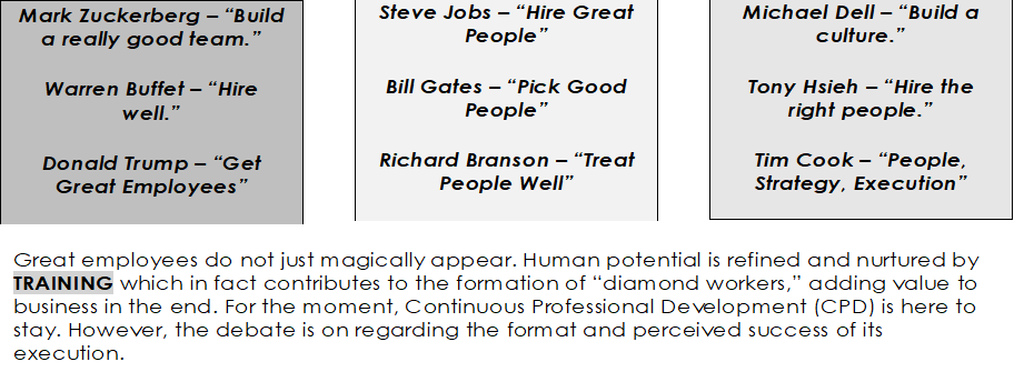 Human Capital is for the moment, is still regarded as a most valuable business asset by the Who’s Who of global business. In a Ten Rules for Success series, published by Linkedin SlideShare in 2016, the Giant Influencers of global business all cited People as an important catalyst for organizational prosperity.